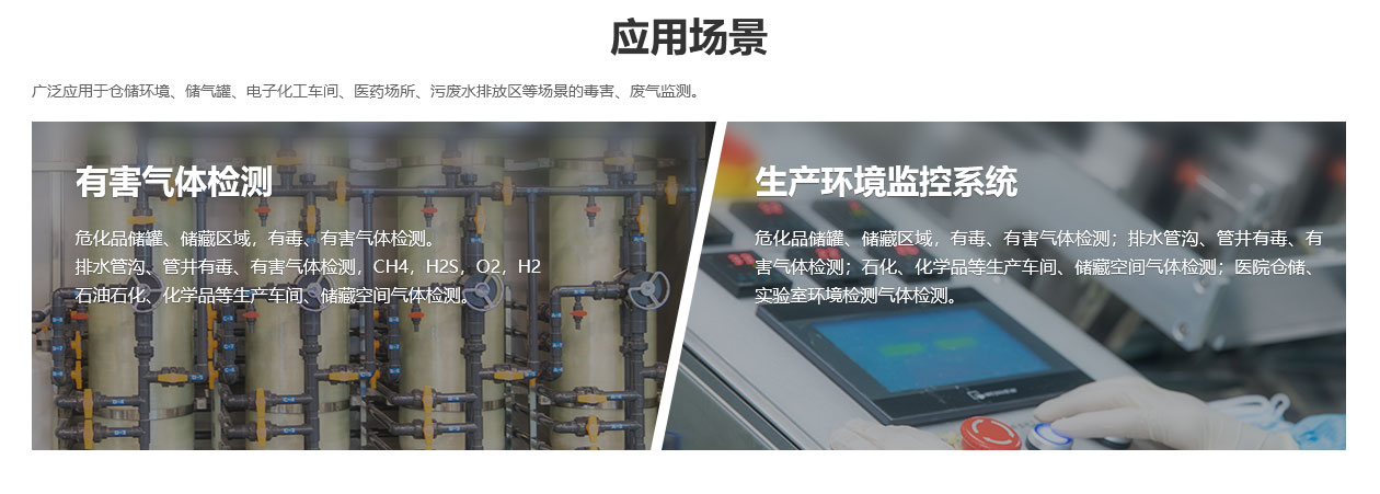 電子生產加工車間氟化氫(HF)監測;充電間酸霧、氫氣(H2)監測;氮氣儲罐區域氧氣(O2)監測;危化品存放區、倉庫、污水處理池等場所有毒有害氣體監測。
