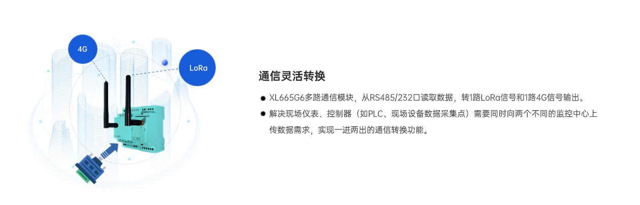 XL665G6多路通信模塊是一款高效靈活的通信轉換設備,可將RS485設備的一路輸出信號,轉為1路LoRa輸出信號和1路4G輸出信號,有效滿足了工控設備同時將數據接入兩個Modbus主站的需求,簡單、方便、易用,成本更低,滿足多種場景需求。