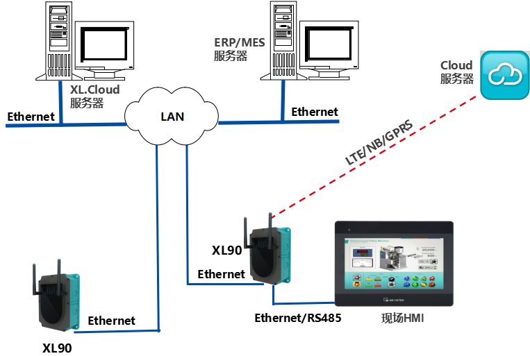 XL90將數據轉發給現場HMI;將數據上傳給企業內部的多個系統軟件平臺;通過LTE(4g)/NB/GPRS將數據上傳至云服務器