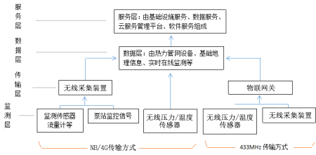 1、傳感器監(jiān)測(cè)層:主要有各種監(jiān)測(cè)傳感器組成,比如壓力、溫度、流量、地理與換熱站監(jiān)控設(shè)備組成。