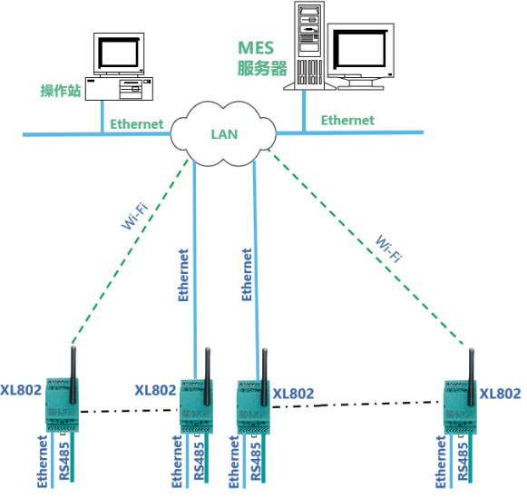 ? XL802 通信主機通過 Ethernet 或 Wi-Fi ,接入 LAN ,連接 MES 服務器。
