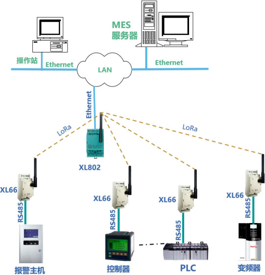 XL66無線轉換器通過RS485/RS232接口讀取設備數據,設計XL802通信主機安裝在LAN口附近接入局域網,并通過LoRa無線接口,從XL66無線讀取設備的運行數據,通信協議轉換處理后,通過Ethernet,轉發數據至MES。