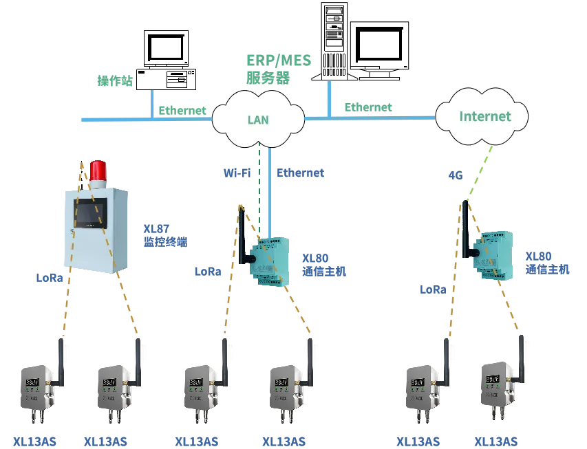 XL13AS無線風管風速傳感器通過LoRa無線傳輸方式,將數(shù)據(jù)上傳至XL802通信主機,通信主機可選以太網(wǎng)、Wi-Fi、4G通信方式,推送數(shù)據(jù)至監(jiān)控平臺、企業(yè)生產(chǎn)管控服務器等。