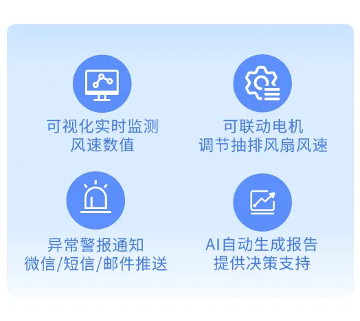 根據(jù)現(xiàn)場需求,可聯(lián)動電機,當風速過小或者過大,自動調(diào)節(jié)抽排風扇的轉(zhuǎn)速,以保持風速控制在合適范圍內(nèi)。
