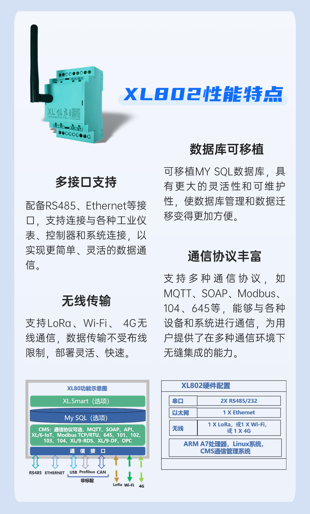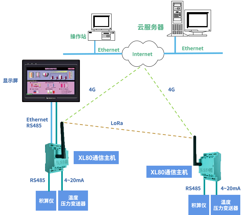 XL802通信主機,可同時將數據推送到現場顯示儀表、物聯網關,實現現場就地監控和平臺遠程監控。