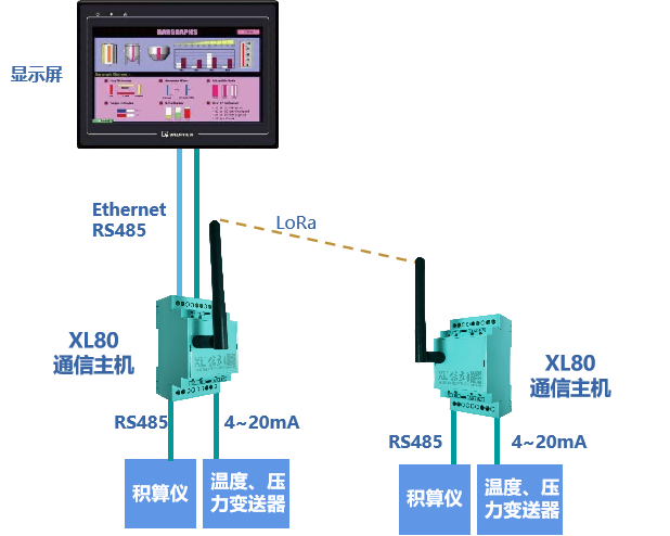 在采集壓力變送器、積算儀等儀表信號的同時,通過LoRa無線讀取其他采集點的數據,通過以太網或RS485接入現場觸摸屏、數顯表等顯示設備,實時展示當前管道運行數據。