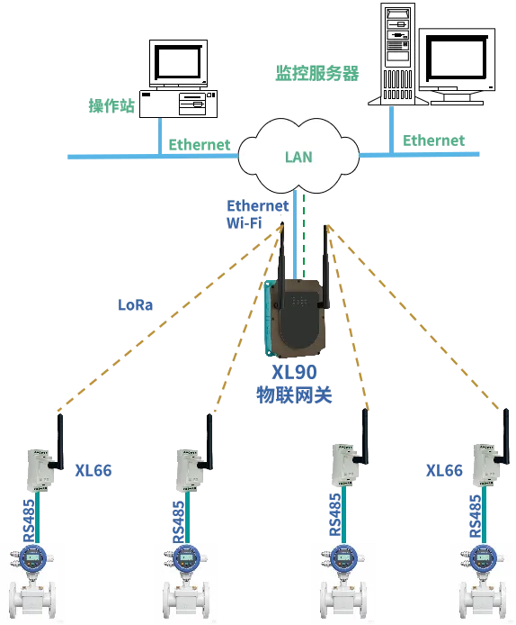 構建星型 LoRa 無線傳輸網絡,以XL90物聯網關為中心節點,多個XL6666作為終端節點分布在各個流量計安裝位置。XL6666 采集流量計數據后,通過 LoRa 無線傳輸數據給網關,網關通過Ethernet/WiFi將數據傳輸給中控室服務器。
